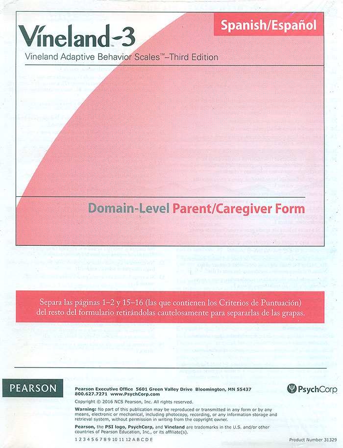 Paquete de 25 protocolos en español de Vineland-3 Spanish parent/caregiver form - domain level (abbreviated) version