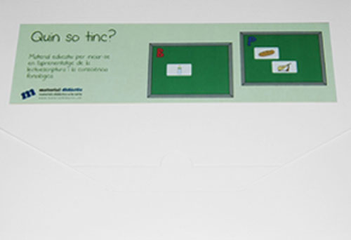 Material que consta de 2 fulls A4 i 10 fitxes plastificades. En un d'aquests fulls A4 hi ha escrit el so /p/ i en l'altre el so /b/. En les 10 fitxes hi ha diversos dibuixos per classificar-los segons el so corresponent.