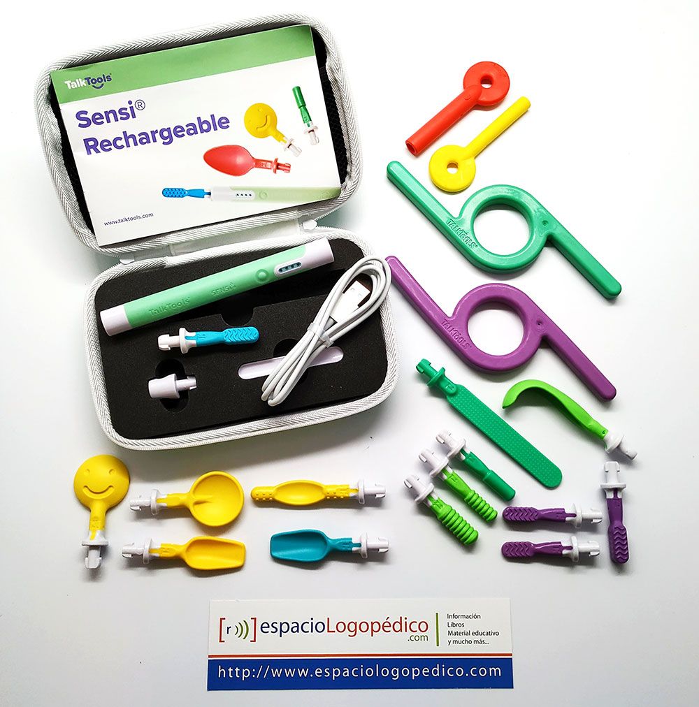 Paquete completo con las principales puntas que necesita el terapeuta, en un práctico estuche verde menta viene el Sensi que es recargable, un manual de Sensi y cuatro chewys diferentes para mejorar las habilidades de morder y masticar.