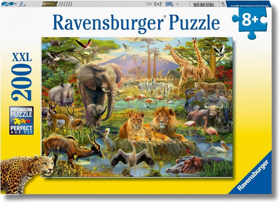 Puzle de 200 piezas formato XXL con piezas más grandes y fáciles de manejar que representa una escena animada de la sabana africana con animales salvajes como elefantes, leones y jirafas.