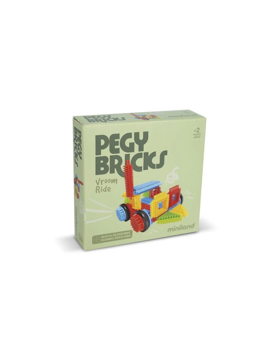 Pegy Bricks: Vroom Ride es un conjunto de construcción inicial que permite crear divertidos vehículos. Utiliza piezas grandes y seguras tipo ''peg'' (espiga) que se encajan fácilmente, e incluye ruedas para dar movimiento a las creaciones.