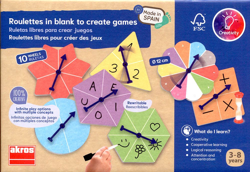 Juego libre con 10 ruletas de diferentes formas y colores para inventar juegos de azar con múltiples opciones. Desarrolla la imaginación y la creatividad con estas ruletas progresivas para trabajar las letras, las cantidades, los colores y todo tipo de conceptos con tus propias reglas de juego.
