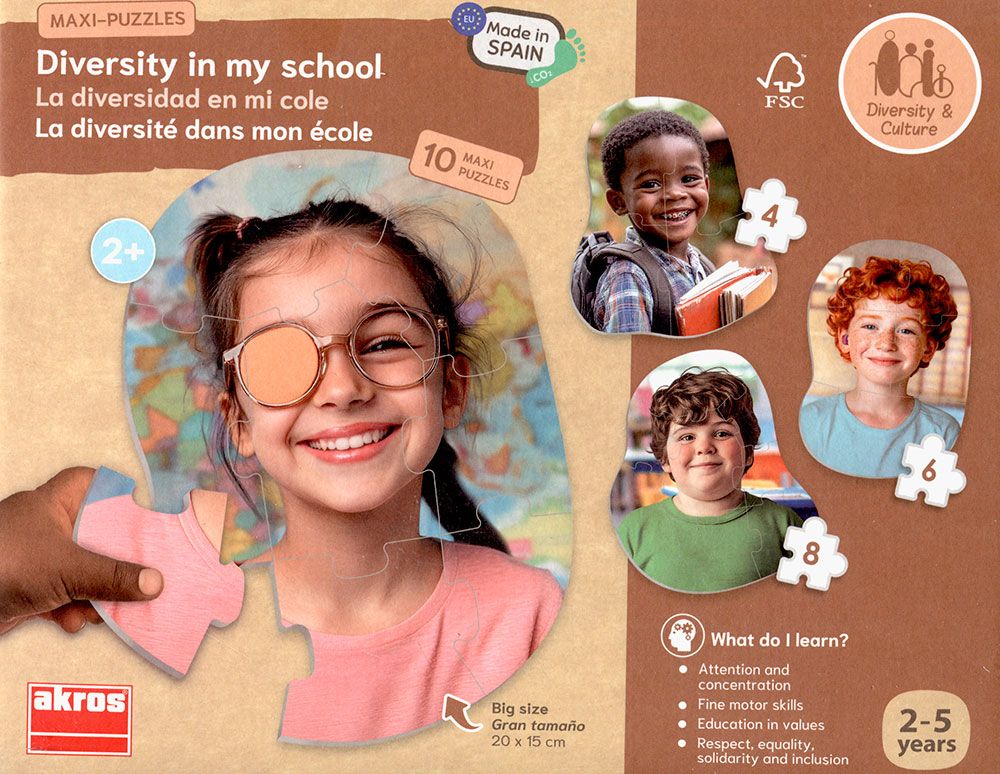 Conjunto de 10 puzles silueteados de gran tamaño, con fotografías inclusivas de niños en el cole, que ayudan a fomentar actitudes de respeto hacia la diversidad.